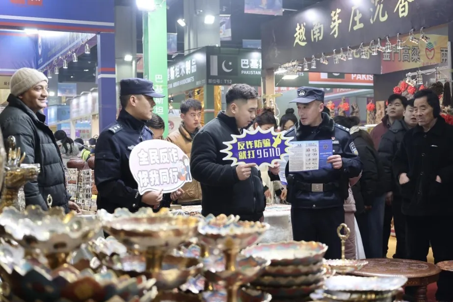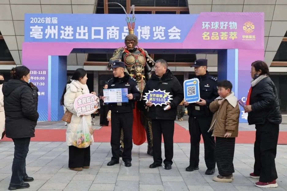 为进一步提升广大群众防范电信网络诈骗的意识和能力,全力营造全民反诈的浓厚氛围,2026年1月5日,亳州市公安局高新分局民警辅警走进康美会展中心,借助亳州进出口商品博览会暨新年购物节,开展“全民反诈”主题宣传活动。