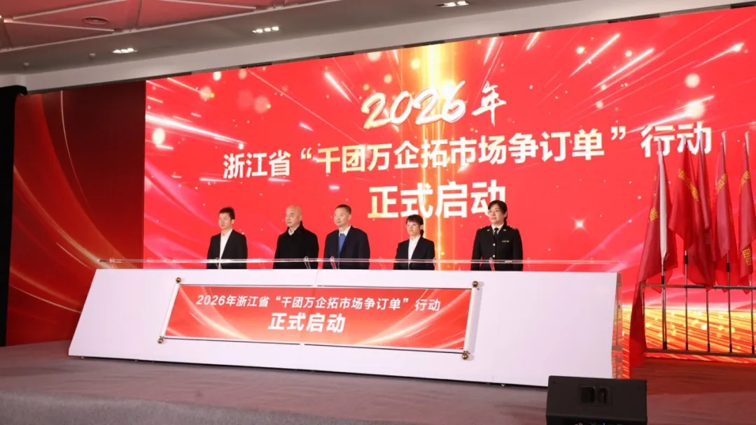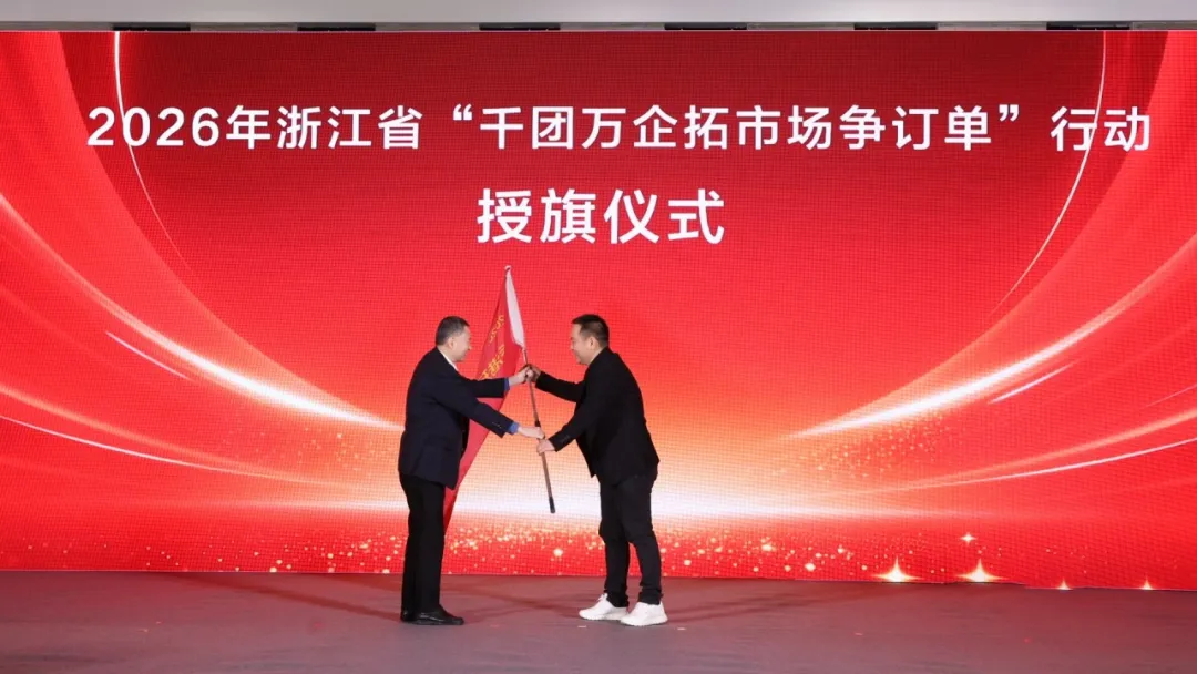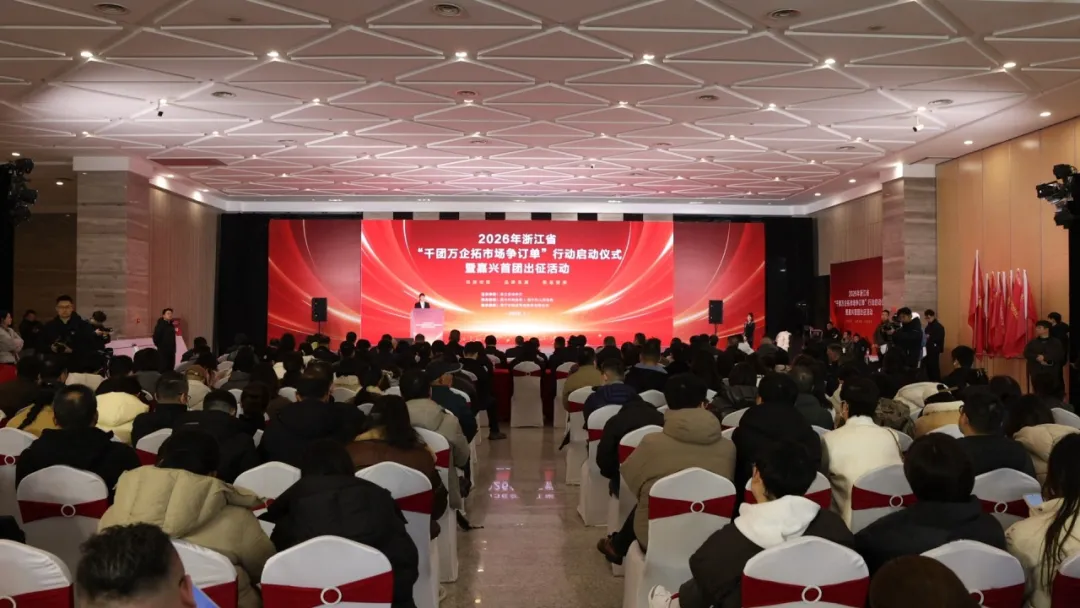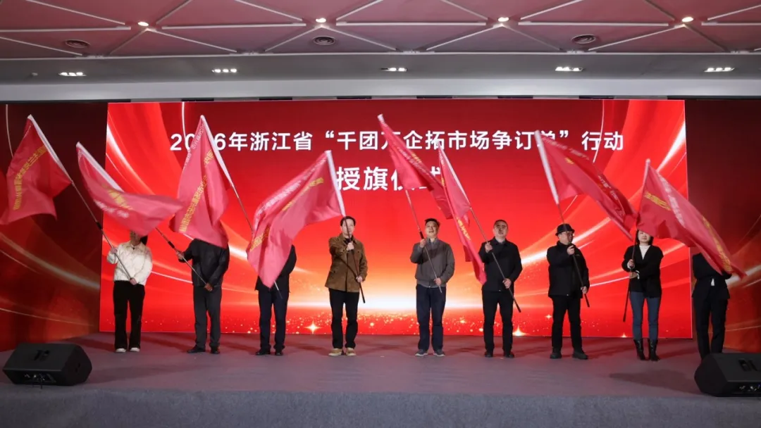 1月6日下午,2026年浙江省“千团万企拓市场争订单”行动启动仪式暨嘉兴首团出征活动在海宁举行。来自家纺、服装、玩具等产业的九个团组的企业家率先出征,奔赴法兰克福家纺展、香港玩具展等九个国际性展会。