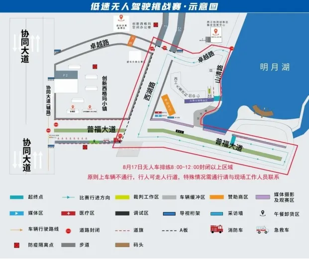 低速无人驾驶挑战赛将于8月21日15:00—19:00举行。期间普福大道与协同大道交汇处,车辆往五横线方向行驶、往P3位置停靠,禁止车辆驶入协同大道(辅路)、普福大道通行。卓越路与西湖路交汇处,禁止车辆驶入西湖路南段,西湖路北段,车辆停靠卓越路西段区域(创新Σ空间)。五横线与协同大道交汇处和五横线与西湖路交汇处,工作车辆停靠P3区域。