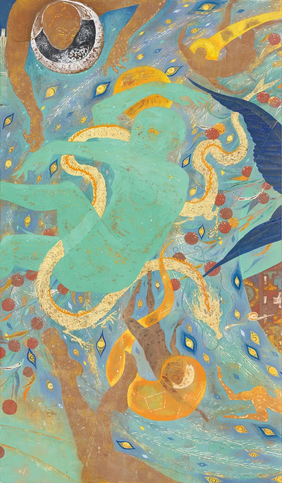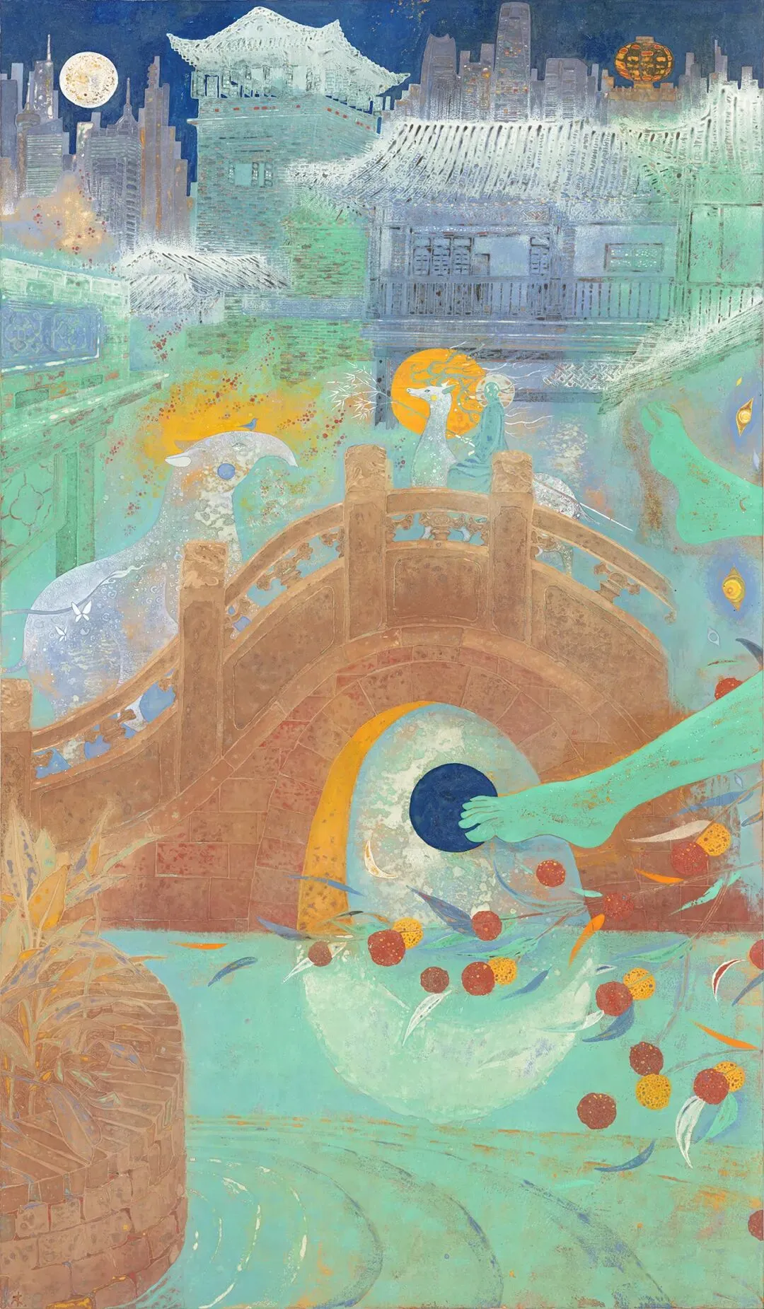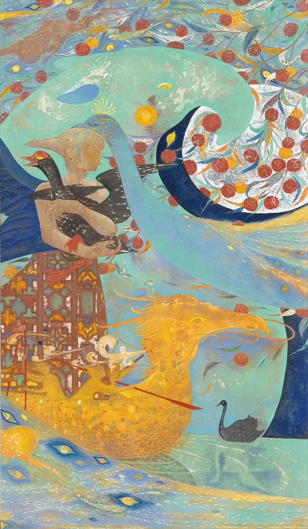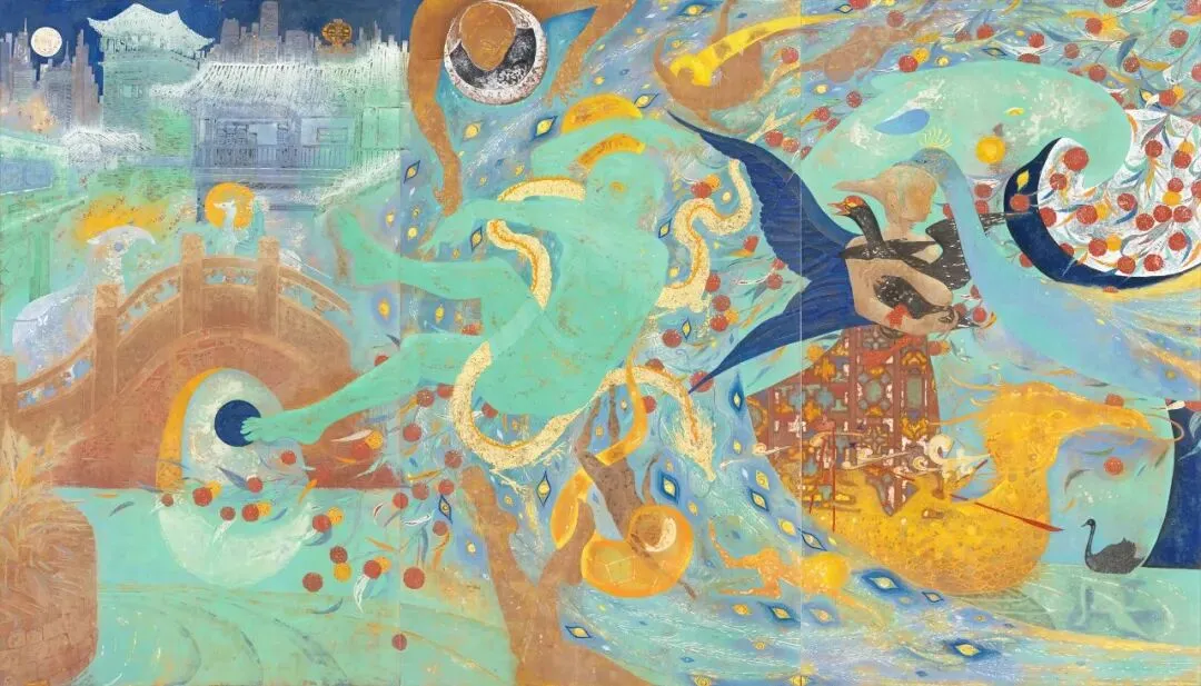 陈木《梦游园》H180×W300cm 纸本矿物材料 2025年壁画《梦游园》以岭南四大名园之一的可园为题,描绘莞城生活变迁。作品构图以荔枝、孔雀等东方花鸟回环贯穿,透过古代壁画中常见的“异时同图”叙事手法,描绘梦境故事的三个篇章:《梦见桥》、《梦为鱼》、《渡梦园》