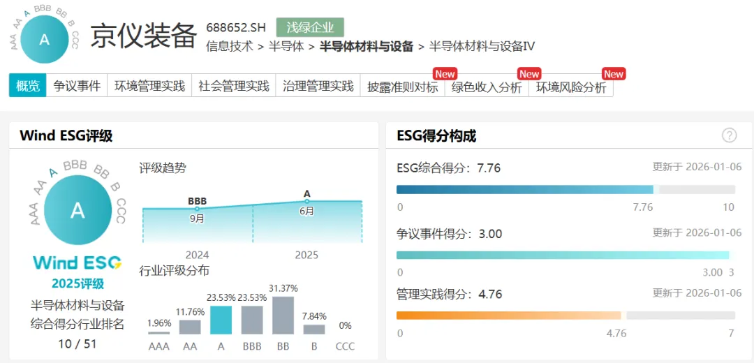 2025年,京仪装备Wind-ESG评级由BBB提升至A级,首次进入行业前十。Wind-ESG评级作为国内权威的第三方ESG评级,以其高标准和严要求受到监管与资本市场的广泛认可。评级跃升标志着京仪装备在企业治理、环境保护、社会责任履行等方面取得了实质性进展。