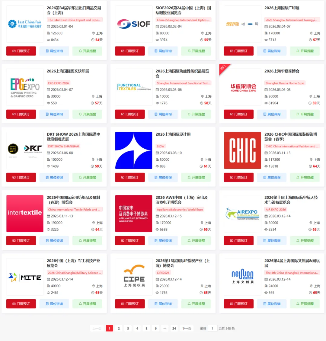 2026年上海世博展览馆有哪些展会将会开展?家博会、路亚展、纺织展、电子展、游艇展、包装印刷展、医疗展......本文小编将会为您汇总2026上海世博展览馆全年展会排期时间表,门票领取放在下方,限时预约逛展哦~