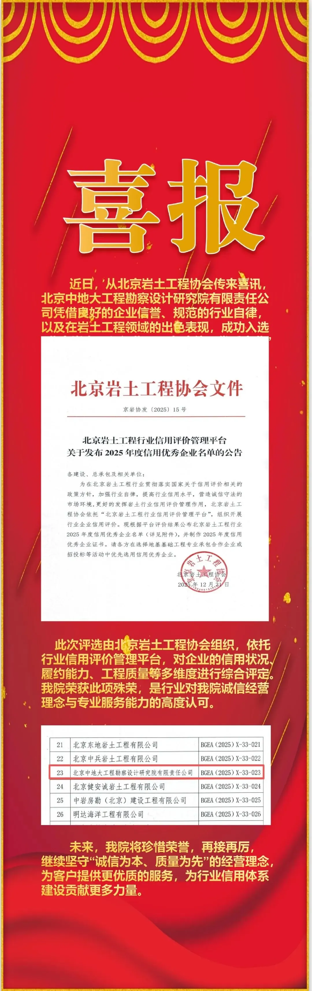喜报 | 我院荣获“北京岩土工程行业2025年度信用优秀企业”称号