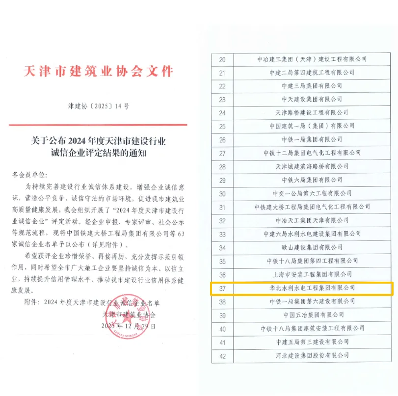 近日,天津市建筑业协会正式公布2024年度天津市建设行业诚信企业评定结果,华水集团凭借卓越的综合实力与良好的社会信誉,成功获评“2024年度天津市建设行业诚信企业”。
