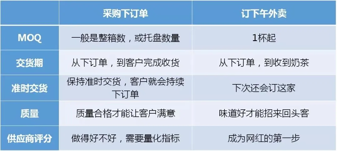 珍妮花最近从办公室文员转岗来做采购,这个新职位貌似没有想象中的轻松。又是一个慵懒的午后,珍妮花在和同事聊完了各种热点、八卦、育儿闲话后,看看时间已经快接近1点半了,是该回到工位上去做事了。珍妮花看了看今天的to do list,又到了每月给供应商下订单的日子了。一想到这里,她的心情就开始变得很糟糕,面对这么多的供应商、不同的价格,怎么做出最合适的选择呢?每个供应商有着不同的MOQ、交货周期和订货折扣。。。看着一长串的采购清单,珍妮花的头都已经大了。算了,还是明天再说吧。珍妮花伸了伸懒腰,活动了一下手腕肩膀,看看时针已经快指向3点了,干脆放松休息一会儿,随便犒劳一下自己辛勤工作了那么久。她在微信上呼叫办公室下午茶姐妹花,有没有人想要一起订个奶茶外卖。很快有人回应了,爱美丽在群里很兴奋地说“好啊”,于是俩人愉快地达成了一致。珍妮花打开手机上的外卖APP,在经过了一番价格和优惠折扣的综合比较后,她选了一家公司附近的网红饮品店。下好了单,根据APP系统显示,奶茶店铺已经接单,外卖小哥将在30分钟后送到。珍妮花在电脑上回复了几个邮件后,又刷了刷微信朋友圈,百般无趣之中打开外卖APP,查看订单的状态。现在的网络科技真是发达,通过APP可以看外卖小哥的实时位置。眼瞅着地图上显示小哥离目的地距离越来越近,他却跑到了马路对面的办公楼去了。“现在送外卖的也真是的,为了多送几单也是蛮拼的”珍妮花暗自腹议着小哥,心里想如果他送得晚了坚决不给他五星好评。幸好没过多久,外卖终于到了。小哥气喘吁吁地和珍妮花说着“这是您的外卖,麻烦待会儿给我一个好评,谢谢”。看着小哥态度很客气,珍妮花满口答应“好的,好的,谢谢你噢”,转身叫来了爱美丽,一起开始享用下午茶,来捱过下班前无聊的时光。珍妮花在下外卖订单的时候,比较了不同的饮品组合和不同的优惠折扣券,选了最有性价比的套餐。奶茶的MOQ是1杯,买的多就会有店家的减免优惠。外卖还有最小的起订金额,比如20块钱以上才能接受订单。在做采购订单的时候,也需要充分考虑很多因素,比如MOQ,订单金额,SKU可以供消耗使用的时间等等。如果订单量小于MOQ,供应商就不会接受订单。下单数量不是大于MOQ就万事大吉了。对于一些slow moving的SKU,还需要注意MOQ预计可以消耗的时间。如果超过了一年以上的,就需要重点关注了,这种SKU一旦遇到产品升级迭代,极有可能变成呆滞库存死库存。有些供应商是有最小订单金额规定的,如果没有达到合同中规定的金额,采购方需要支付一些额外的费用。如果买卖双方是做Ex-works条款的,采购方还需要关注采购订单金额,货物一旦离开供应商工厂仓库以后,库存的所有权就归属于买方。而卖方就可以根据实际出货数量,开具货物发票给买方。这笔采购订单的费用,就成了买方的应付账款,需要在合同约定的时限内完成付款。采购管理需要时刻留意在途库存和应付账款金额。在采购管理中,需要在Item level的基础上,分析每个SKU可以供消耗的时间,也就是说所有的库存(仓库内+在途)可以使用到什么时候,根据预先设定的交货期,来判断是否会有断货的风险。同时,还可以根据这个信息,来分析库存的数量是否合理,是否会产生了过量库存Overflow inventory。珍妮花从下外卖订单,到收到奶茶为止的时间就是交货周期。交货期超过一个小时的店铺是不会被考虑的,外卖对于时效性的要求很高,这也是很多外卖小哥开启疯狂驾驶模式的“初心”。供应商交货周期也叫做订单履行周期,以奶茶类产品的现点现做的Make to order模式为例,整个周期中主要的时间段包括以下这些:搞清楚供应商交货周期很重要,因为这是优化供应流程、控制库存成本、降低供应链成本等活动的基础之一。找出问题症结所在,才能有效地采取相应的措施进行改善。珍妮花给奶茶店和外卖小哥五星评价,就是完成了对供应商的交货表现打分,这些既有对产品的,又有对服务的评价。奶茶店评分的高低,影响着顾客们选择的优先级,外卖小哥评分的高低,决定着他们的收入。在供应商管理中,交货表现需要评估的内容就更加丰富,主要表现在这两个维度:在供应链运作参考模型(Supply Chain Operations Reference model,简称SCOR模型)中,也有类似的定义。在SCOR模型第一层的战略指标中就有一项是供应链交付可靠性,其中就明确定义了衡量供应链的交付质量:符合要求的产品在要求的时间段、要求的地点交付给正确的客户,产品包装完整,数量和质量无误,没有瑕疵,文档齐全。它对应的绩效指标就是订单完美履行率。看来珍妮花已经初步具备了做好采购的资质,她已经历了一系列完整的筛选供应商、下订单、收货和评估的采购过程。如果她把订下午茶的经验也应用在日常采购工作中,那么明年公司的升职加薪一定会有她!