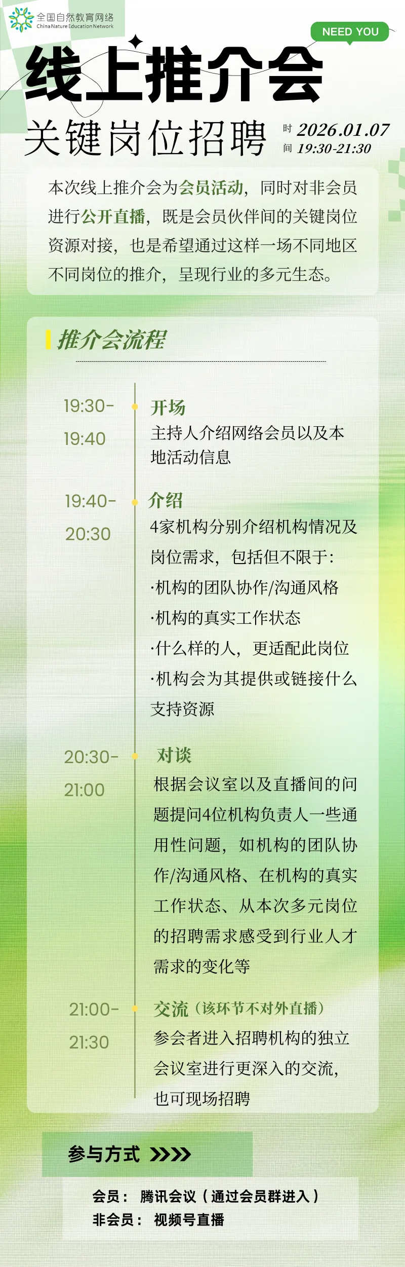 会员伙伴们可以通过会员群内发布的会议链接参与推介会,非会员想要参加线上推介会,直接与boss们沟通咨询,并现场应聘岗位的伙伴们可以在1月7日之前加入会员。