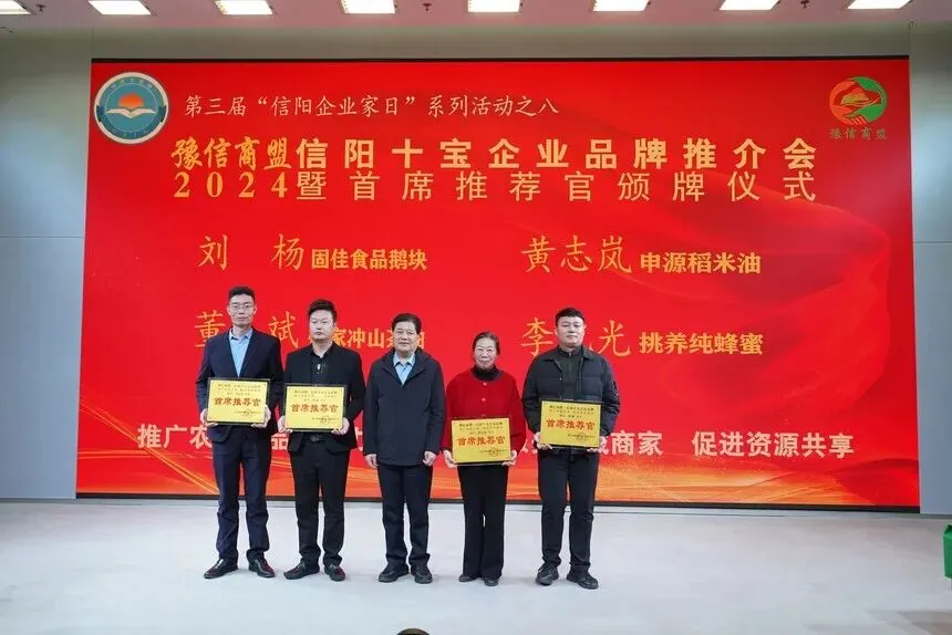 在本次推介会上,参会领导向旺鑫空心贡面、山净山茶油、蓝天茗茶 、信南香焖罐肉、同信葛根粉、颂瑞甄选、众腾张记卤甲鱼、南湾湖生态酒 、森珍干货、云山龙吟茶叶、古茶沟山泉水、灵山古艾等12家企业颁发了优秀企业荣誉证书,固佳食品鹅块、申源稻米油、挑养纯蜂蜜、信茶春茶叶、光州芡实、报晓峰矿泉水、玉凤姐热干面、令尹黄酒、荷甲源卤甲鱼 、月华峰山茶油等12家企业颁发了突出贡献荣誉证书,为固佳食品刘杨、申源稻米油黄志岚、何家冲山茶油董斌、挑养纯蜂蜜李记光等4位企业负责人颁发了首席推荐官证书。