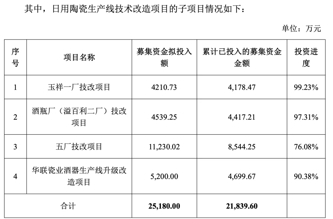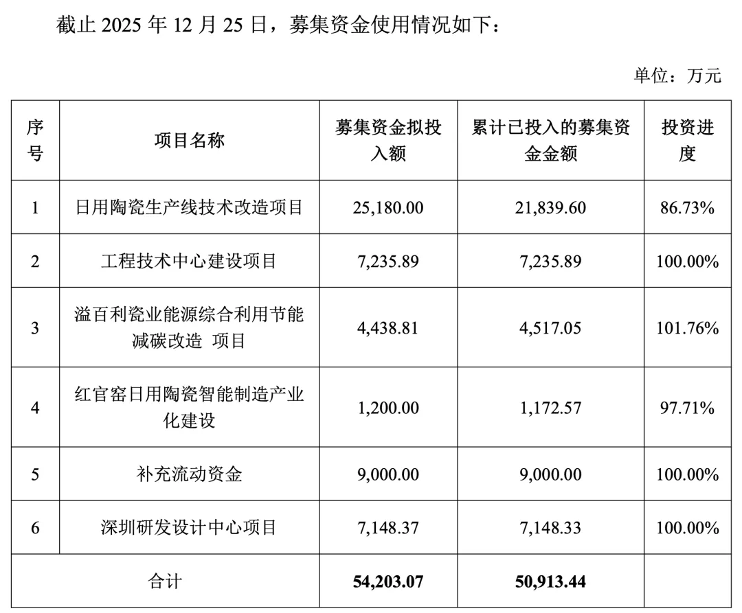具体到“日用陶瓷生产线技术改造项目”,该项目计划总投资2.52亿元,截至2025年12月25日累计投入2.18亿元,投资进度为86.73%。