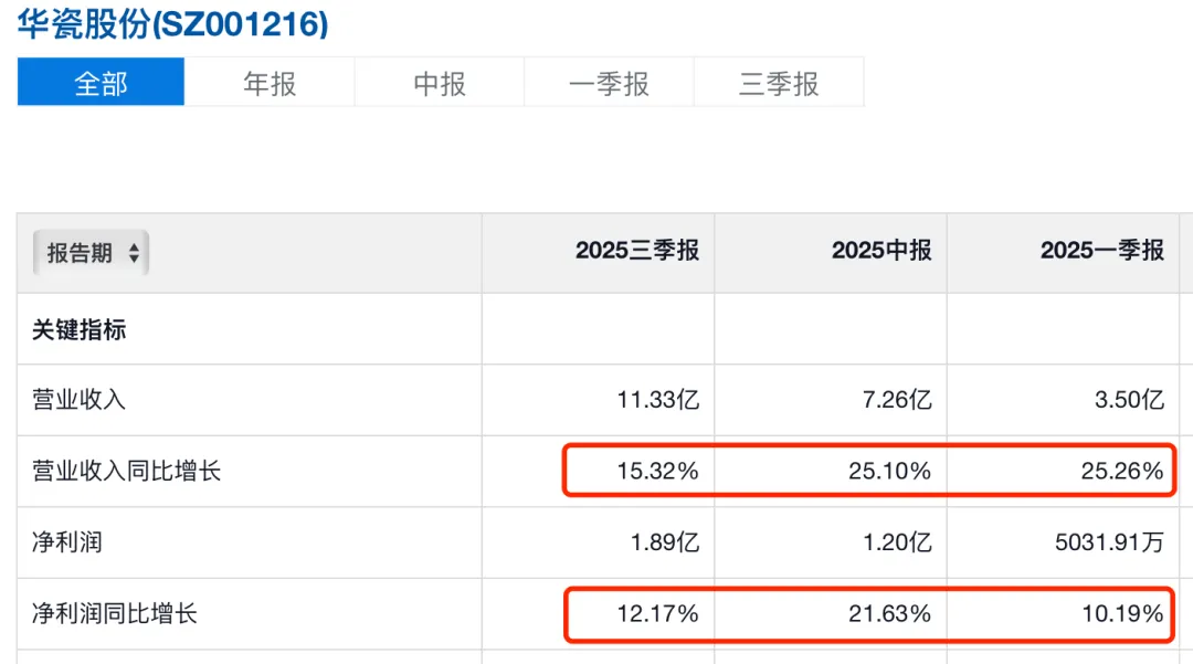 华瓷股份成立于1994年8月1日,主要从事日用陶瓷制品的研发、设计、生产和销售。从业绩表现来看,进入2025年,华瓷股份于一季度报、中报、三季度报,分别实现营收3.5亿元、7.26亿元、11.33亿元,分别增长25.26%、25.1%、15.32%;实现净利润5031.91万元、1.2亿元、1.89亿元,实现同比增长10.19%、21.63%和12.17%。连续3期实现营收和净利润的双位数同比增长。