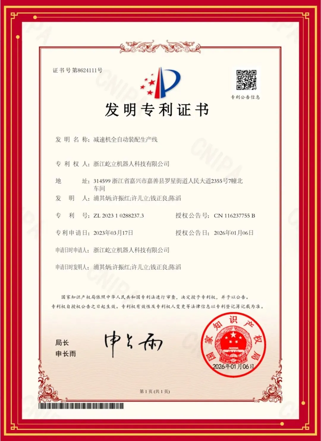 此次发明专利的获得,既是国家知识产权局对屹立机器人技术创新能力的权威认可,也是公司践行“以技术创新驱动产业升级”理念的生动体现。自成立以来,屹立机器人始终扎根嘉兴,聚焦核心零部件自动化领域,以稻盛和夫“付出不亚于任何人的努力”的经营哲学为指引,鼓励研发团队深耕技术、攻坚克难,累计已获得多项专利与软著。