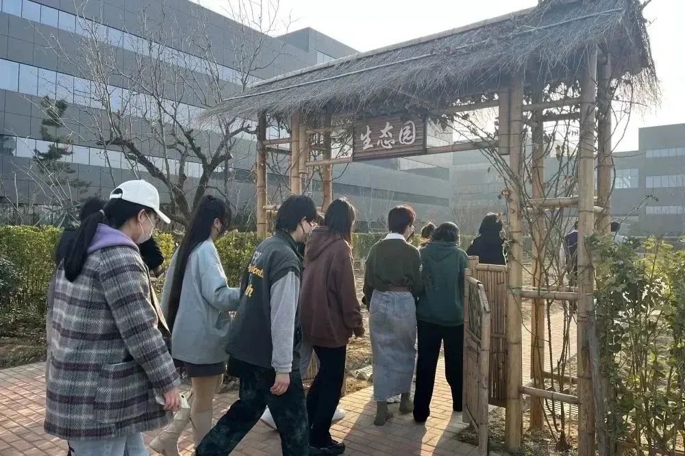毕业生们走进生态园,参观水培绿色果蔬大棚,体验企业特色文化,工作人员向大家热情介绍种植产物并采摘分享品尝。