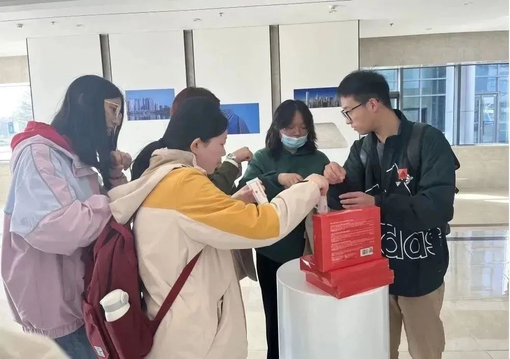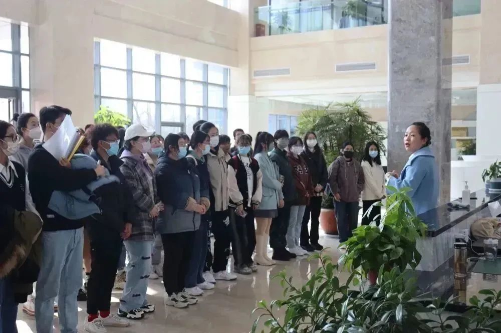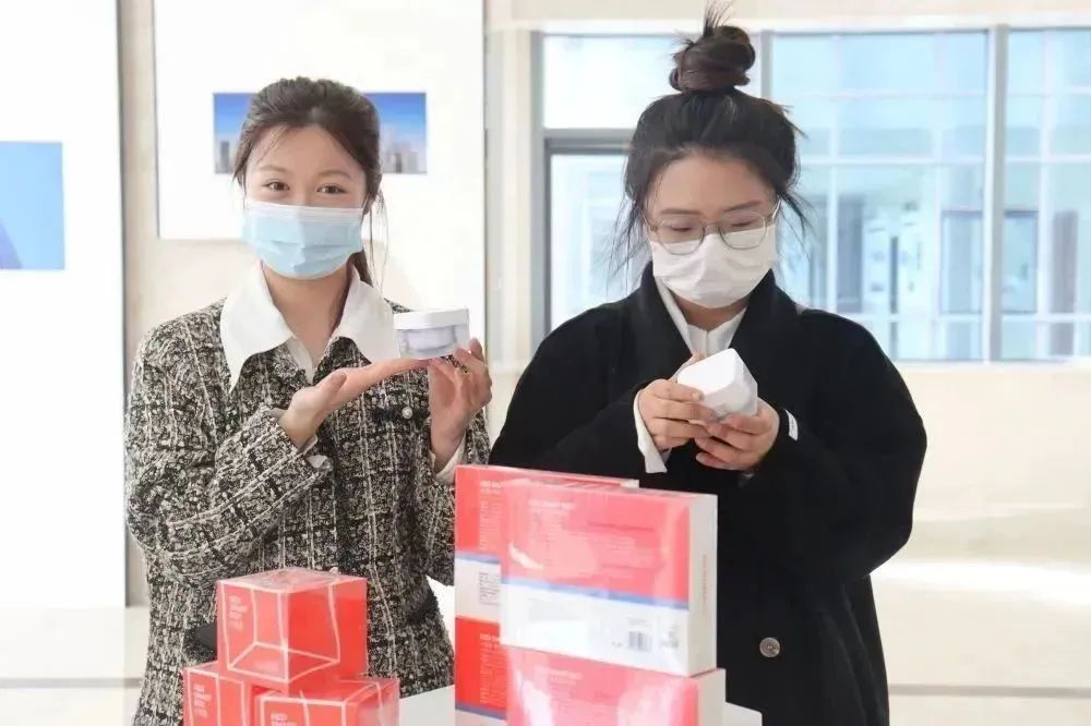 一楼质检研发大厅是该企业参观的第三站,负责人向同学们介绍公司的构成、岗位情况等,并邀请全体师生对公司的各种医美产品进行体验。