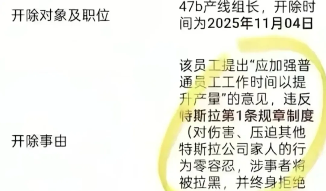 而就这么为”公司着想“的好员工,这换在任何一家企业这名组长都是“前途无量”的,而更让人震惊的是,这名组长被特斯拉由63人组成的管理部门集体投票开除了,投票结果支持开除的63人,0人反对,全票通过同意开除,开除的理由是该组长违反特斯拉第一条规章制度,对伤害、压迫其他特斯拉公司家人的行为0容忍,涉事者将被拉黑,并且终身拒绝录用,涉嫌欺负压迫公司家人。这或许是民众第一次看到因为提出提高产能的建议,而被开除员工的新闻,也第一次听到“公司家人”,真正以人为本的企业对员工赋予“家人”的真正定义。