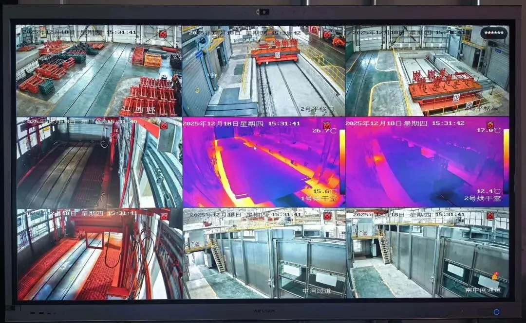 新建喷涂生产线占地面积大、作业环节多,易存在安全盲点,难以实现全时段、全覆盖安防管控。为确保随时监管生产线各个功能室的情况,满足正常安防需求,中心喷涂生产线加装12点位视频监控。主要覆盖2个喷漆室、2个烘干室、中间通道、左右提升门等区域。针对烘干室温度较高情况,专门配选用热成像摄像机。该摄像机不仅能实时监测环境温度,还具备超温自动报警功能,能第一时间预警温度异常风险,为烘干环节安全筑牢“第一道防线”。管理人员通过操作台显示屏,更直观地看到生产环境状态、设备运行情况及人员规范作业等实时信息,实现对现场作业全过程的可视化、精准化管控,有效提升了现场安全监管效能。