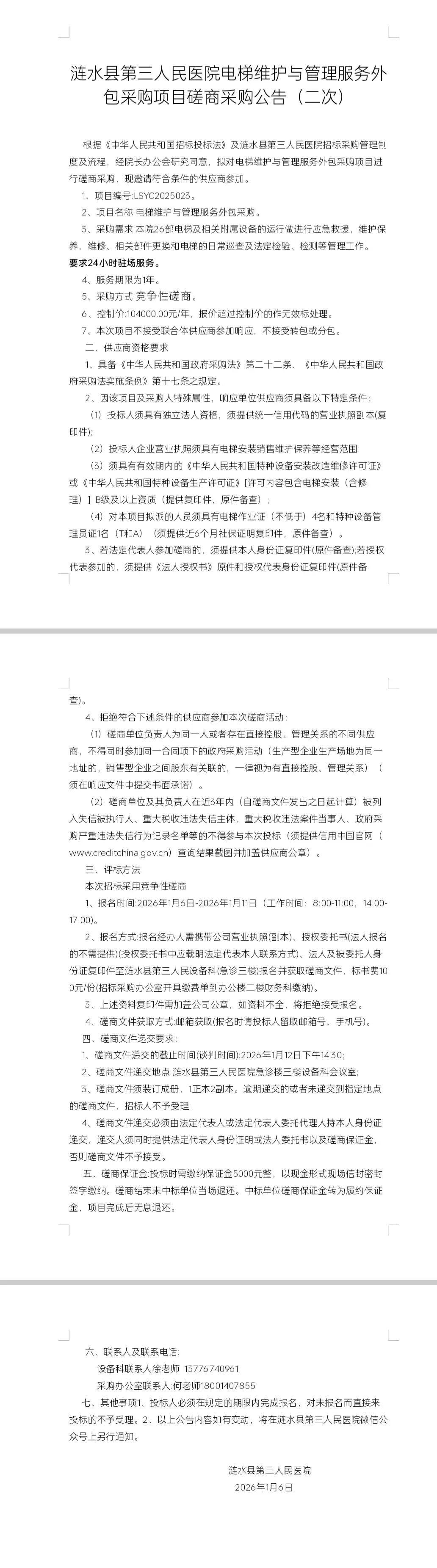 涟水县第三人民医院电梯维护与管理服务外包采购项目磋商采购公告(二次)