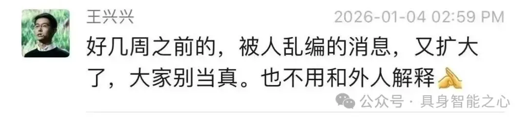随后,一张疑似宇树科技创始人、董事长王兴兴的群聊回应截图在网络流传。