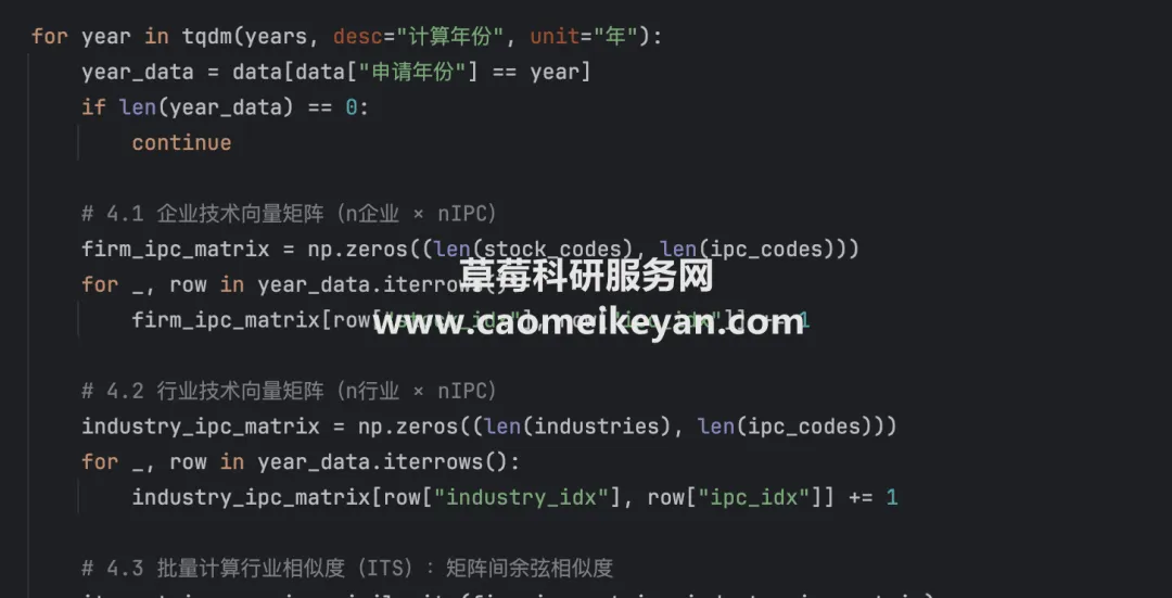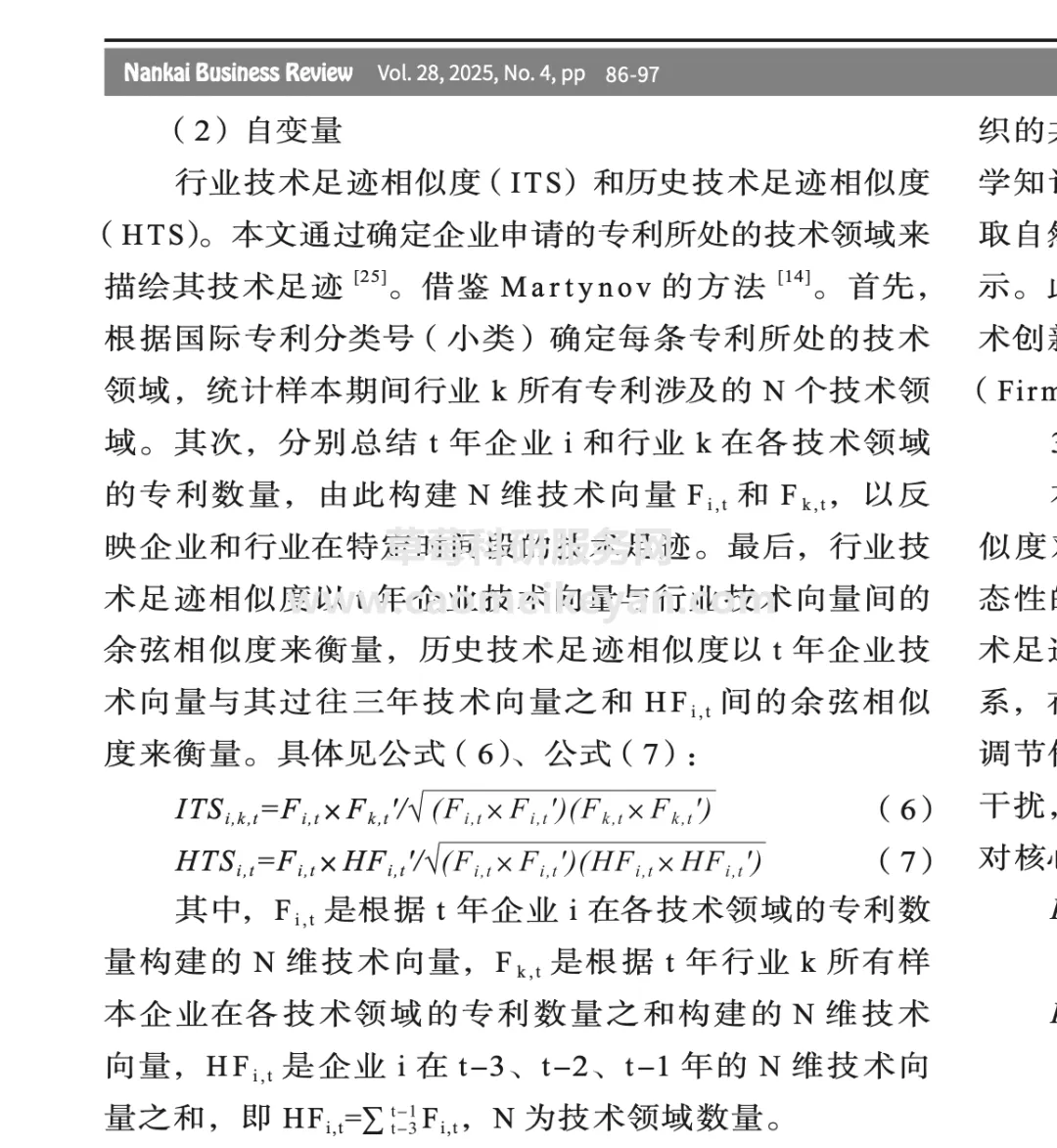 2、测算方式:参考《南开管理评论》龚红(2025)老师的做法,行业技术足迹相似度(I TS )和历史技术足迹相似度(H TS )。本文通过确定企业申请的专利所处的技术领域来描绘其技术足迹 [25。借鉴 M a r t y n o v 的 方 法 [14。 首先,根据国际 专利分类号(小 类)确定每条专利所处的技术领域,统计样本期间行业 k 所有专利涉及的 N 个技术领域。 其 次, 分别总 结 t 年 企 业 i 和行业 k 在各 技 术领域