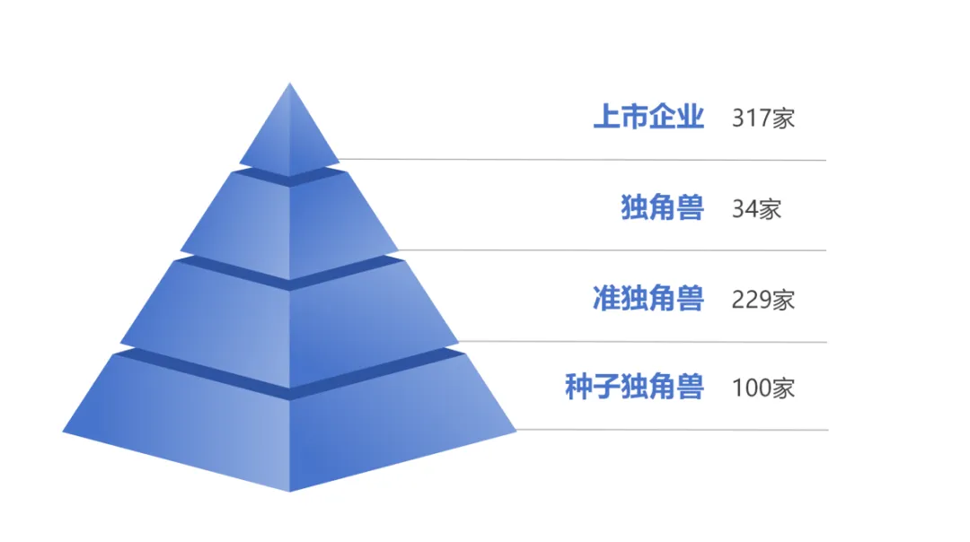 基石与引领(塔尖):317家上市企业与34家独角兽企业(估值超10亿美元),构成了生态的中流砥柱与产业风向标。其中上市企业榜单囊括了上交所67家,深交所122家,科创板45家,北交所8家,其他75家。