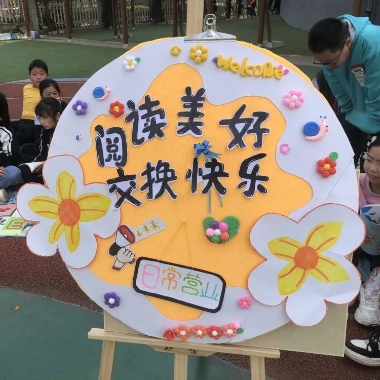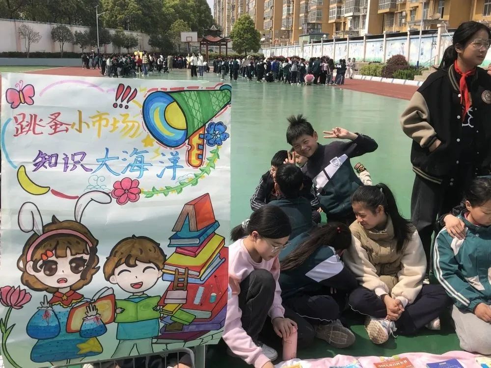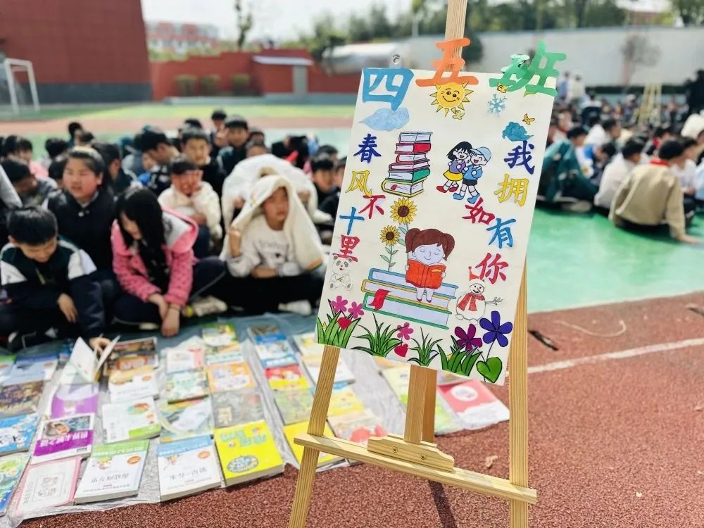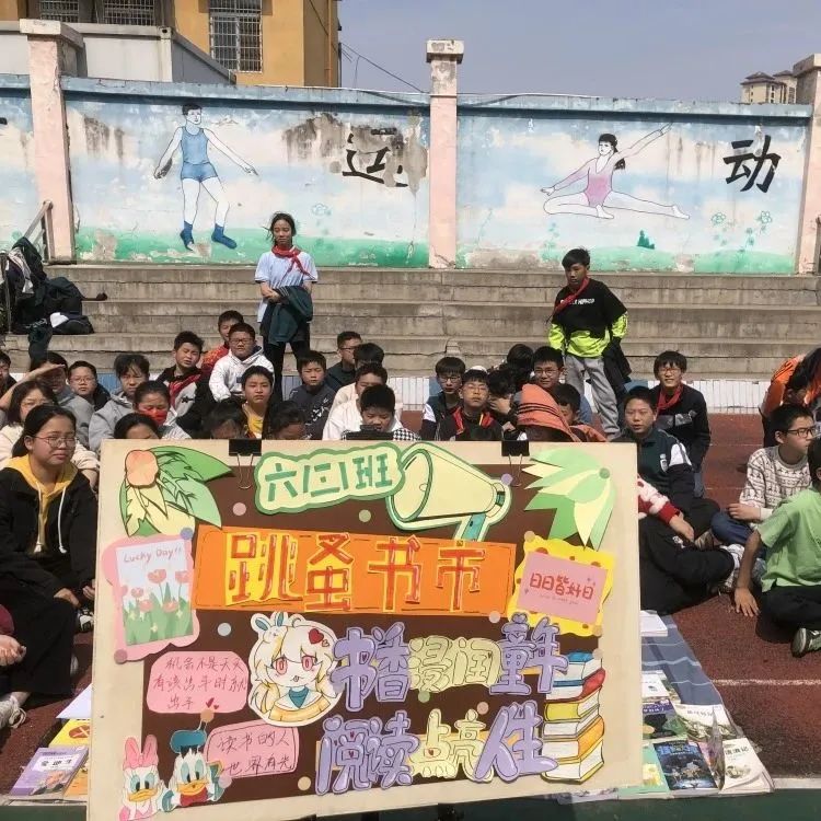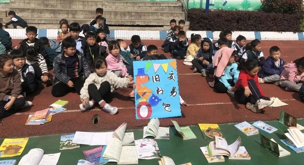 这边走这边看,这边不看终生遗憾。“走过路过,千万不要错过,抓住机会换实惠,现场的图书应有尽有:图画类、童话类,历史类、科学类、益智类等书籍琳琅满目,精装的《四大名著》《草房子》《海底两万里》《鲁滨逊漂流记》……各类好书让人爱不释手。操场上人声鼎沸,热闹非凡。让我们一起走进如火如荼的交易现场。