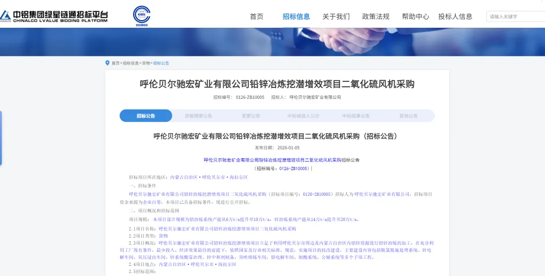 1月5日,中铝集团绿星链通招标平台发布《呼伦贝尔驰宏矿业有限公司铅锌冶炼挖潜增效项目二氧化硫风机采购(招标公告)》,招标编号为0126-ZB10005,招标人为呼伦贝尔驰宏矿业有限公司。
