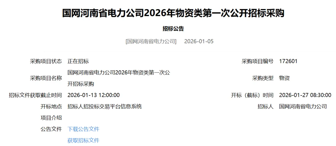 国网河南省电力公司2026年物资类第一次公开招标采购招标公告
