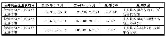 本期经营活动现金流净额为-1.19亿元,同比恶化460.44%,主要因收入增长带动采购备货增加所致;