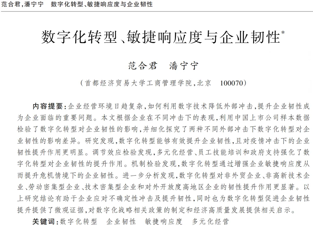 [1]范合君,潘宁宁.数字化转型、敏捷响应度与企业韧性[J].经济管理,2024,46(07):36-54.