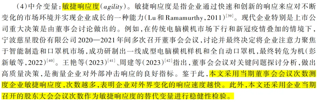 本文采用当期董事会会议次数测度企业敏捷响应度,次数越多,表明企业对外界变化的响应速度越快。此外,本文还采用企业当期召开的股东大会会议次数作为敏捷响应度的替代变量进行稳健性检验。