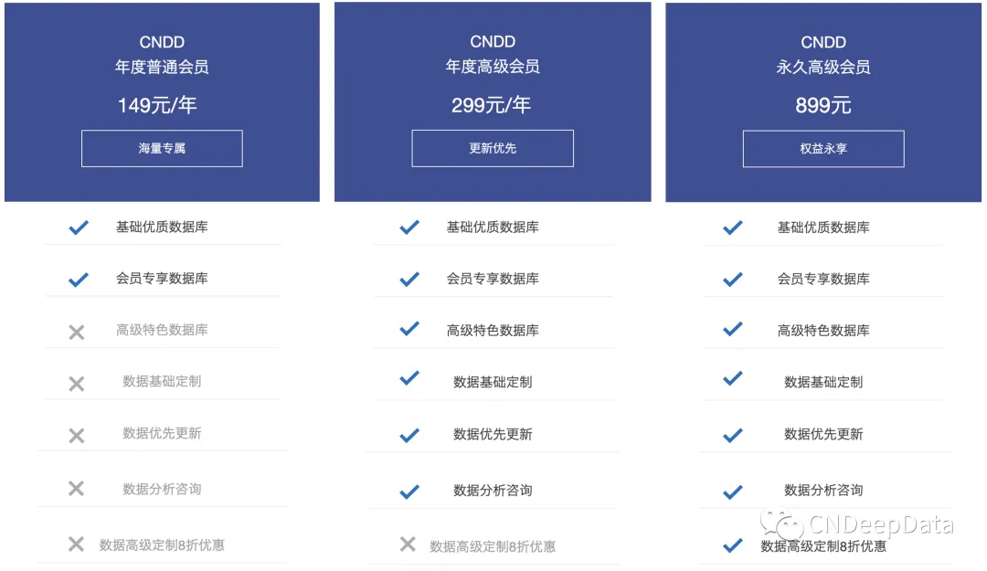 添加客服微信,购买年度普通会员149元,年度高级会员299元,永久高级会员899元,可享CNDeepData所有数据免费获取。