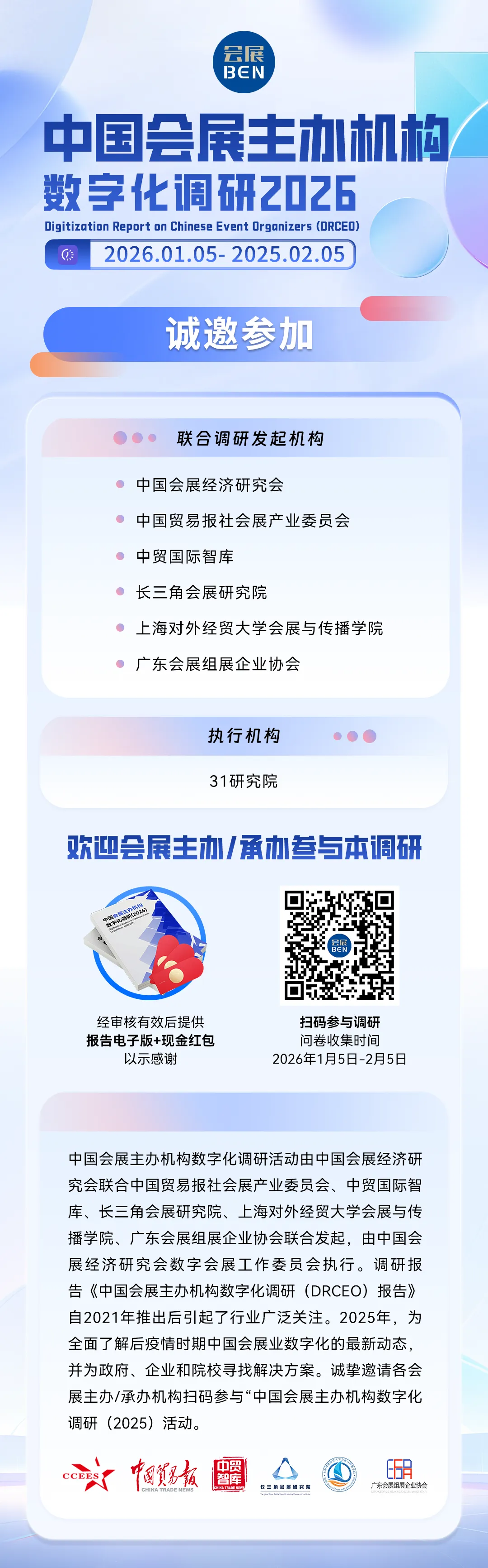自2021年以来,连续五年根据调研发布的《中国会展主办机构数字化调研(DRCEO)报告》引起了广泛关注。在“十五五”开局之年,面临AI智能体深入应用、会展出海数字化等最新趋势,发起机构决定启动第五届调研,以期全面了解中国会展业数字化的最新动态,形成一份能够准确而全面地反映当前形势下会展主/承办方的数字化转型探索与实践应用的调研报告,并为政府、企业和院校寻找解决方案。