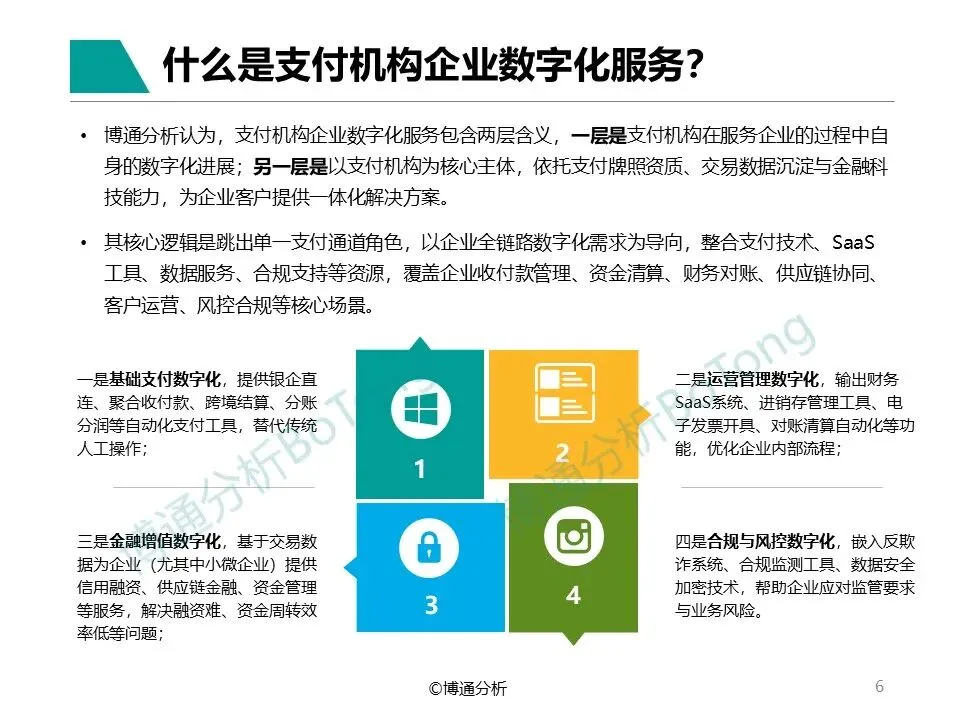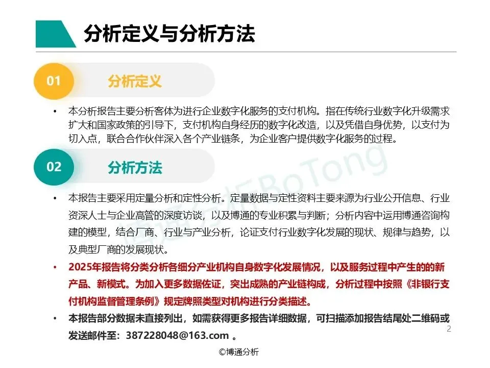 本报告立足支付行业后存量时代的行业特征,以支付机构数字化服务为核心分析客体,结合定量与定性分析方法,系统拆解行业发展脉络、政策导向、细分领域动态及战略发展逻辑,从更宏观的第三方视角呈现支付行业数字化转型的全景图景。