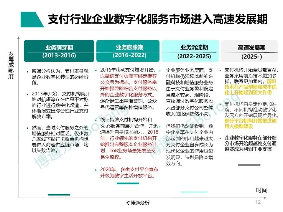 报告聚焦五大细分产业板块,多维度剖析各细分行业在企业数字化服务中的发展现状与演进趋势。通过深度解析各细分领域在产业数字化服务中的产业链构成、盈利模式变革与核心竞争壁垒,结合典型机构案例,揭示支付行业从同质化竞争向精细化、场景化、智能化转型的核心动力,为把握产业发展规律与市场机遇提供全景式参考。