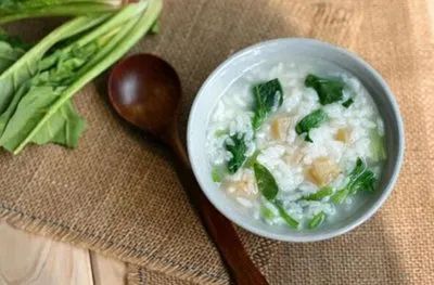 (2)大米煮粥后,将菠菜放入,拌匀,煮沸即成。
