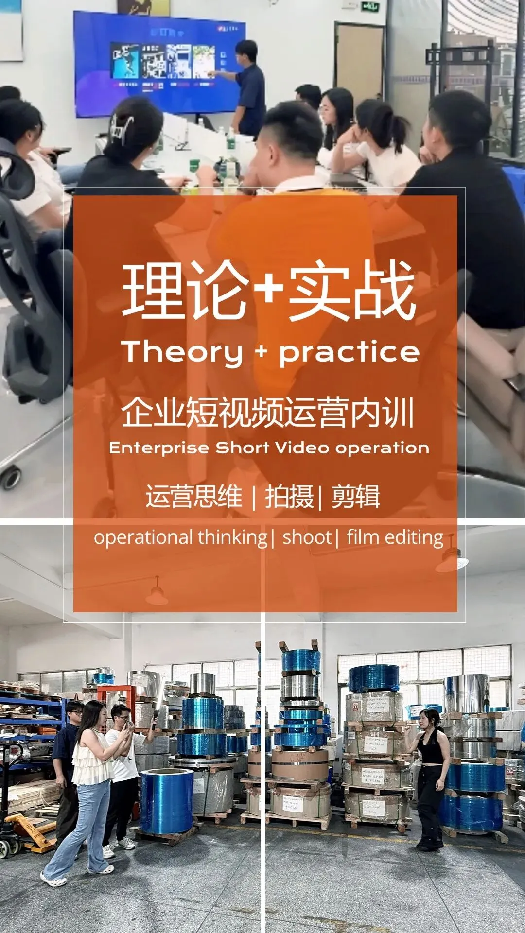 理论讲解后,我们带领龙烨团队的成员走进车间,进行实地拍摄演练。在堆满金属卷材的厂房里,学员们现场学习如何取景、如何展示产品优势、如何通过视频凸显企业实力。