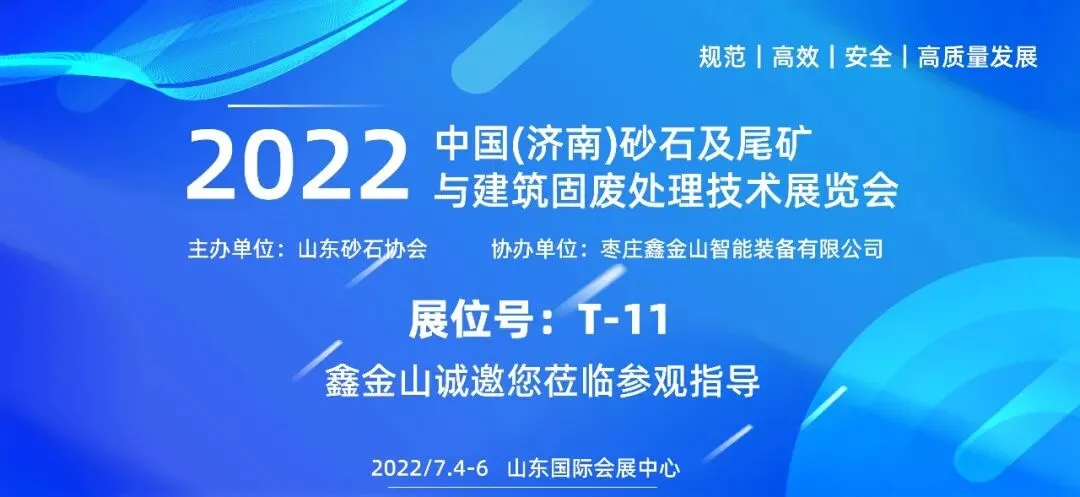 2022中国(济南)砂石及尾矿与建筑固废处理技术展览会将于2022年7月4日至6日,在山东国际会展中心精彩上演,枣庄鑫金山智能装备有限公司作为本次展会的主协办单位诚邀您参加。届时,行业专家学者、矿山和基建企业、大型装备制造商将汇聚泉城济南,展示前沿技术,共谋发展大事。