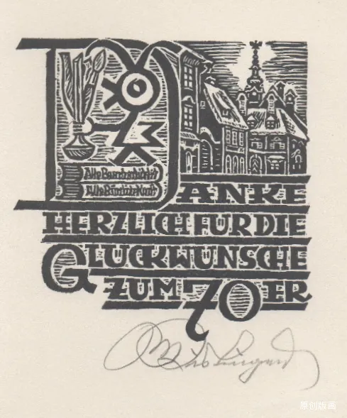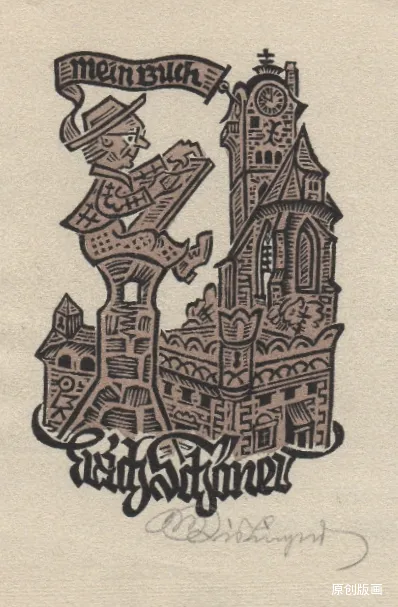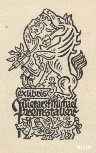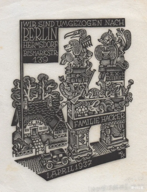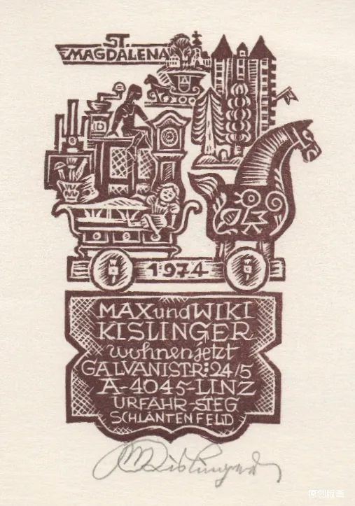 艺术家马克思・基斯林格尔,是一位横跨多领域的创作能手,而其藏书票作品,更是将方寸之地化作了包罗万象的艺术世界。在他的书票里,既有幸福满溢的家庭日常,也有天马行空的宇宙奇景,还有小马车悠然出游的闲适画面,更藏着浩瀚无垠的书籍天地。基斯林格尔尤为擅长在细微之处雕琢匠心,哪怕是木刻人物的脸部特征都清晰可辨,连作画者佩戴的眼镜都能精准呈现,足见其刻画功力之深厚。他的创作风格始终萦绕着温暖治愈的幸福氛围,花草争艳、动物嬉戏的自然之趣点缀其间,更添生机。这些藏书票还兼具贺卡的温情属性,刻着真挚的祝福,被他赠予亲朋、友人及艺术爱好者,让小小的书票,成为了传递情谊与艺术审美的珍贵载体。