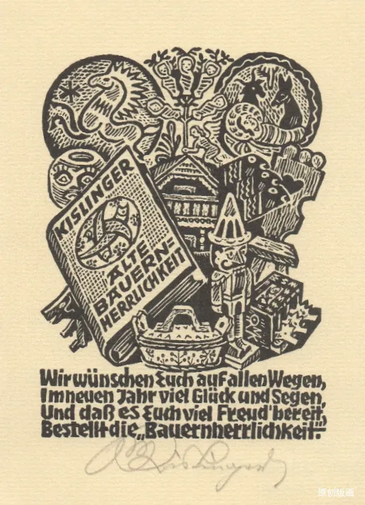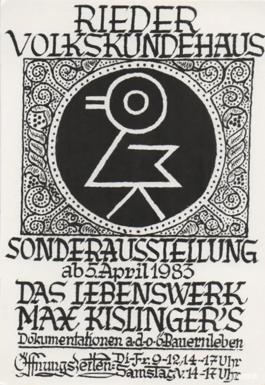 这幅作品正是马克斯・基斯林格尔为自己 1983 年的 “毕生作品特展” 亲自设计的宣传海报 —— 这场展览于当年 4 月 5 日起在奥地利里德民俗馆拉开帷幕,主题聚焦他长期记录的 “农民生活”。海报完全延续了他的创作特质:以其擅长的木刻风格铺展,核心嵌入他作品里标志性的几何符号(这一元素也贯穿于他的藏书票等作品中),外围环绕精致的装饰花纹边框,搭配手写感的装饰字体,既呼应了他常用的创作媒介,也藏着他惯于在方寸间雕琢细节的巧思。而展览主题 “农民生活”,恰好与他作品里家庭、庭院等幸福日常的题材相契合,这张由他亲手设计的海报,本身就是其艺术风格的鲜活缩影。