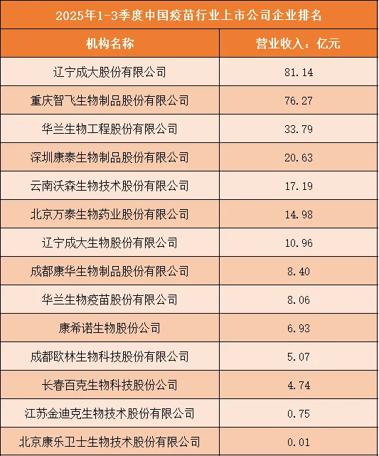 根据申万行业分类,2025年1-3季度中国疫苗行业上市公司按营业收入排名如下:(A股上市公司)