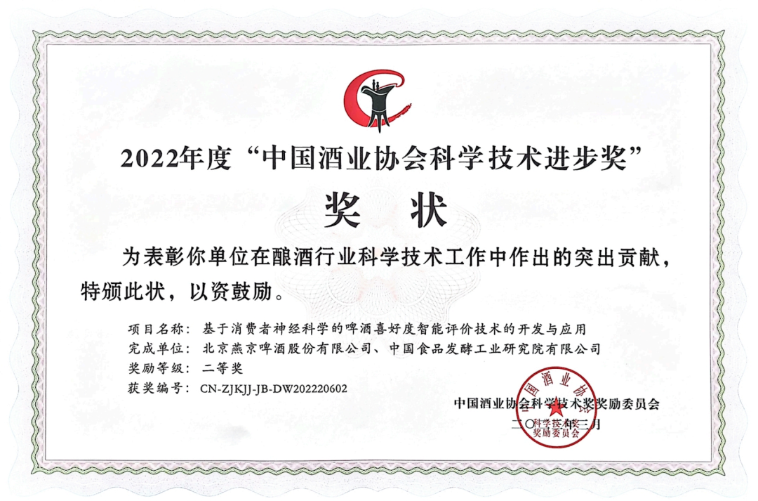 燕京啤酒荣获“中国酒业30年科技成果奖”及2022年度多项科技荣誉。