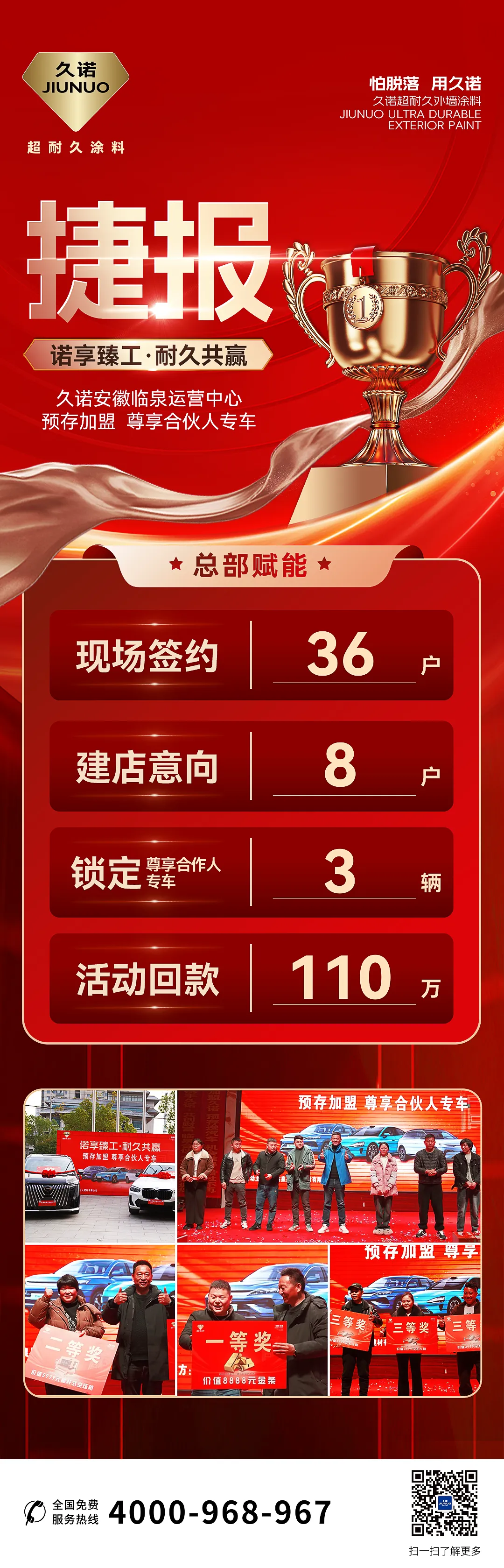 通过精准的市场动作、卓越的产品展示以及力度空前的专项支持,久诺品牌不仅为代理商注入了强大的市场信心,更以实际行动践行了“总部赋能、渠道下沉、协同展业”的战略承诺,为久诺深耕区域市场、完善全国战略布局添上了浓墨重彩的重要一笔。