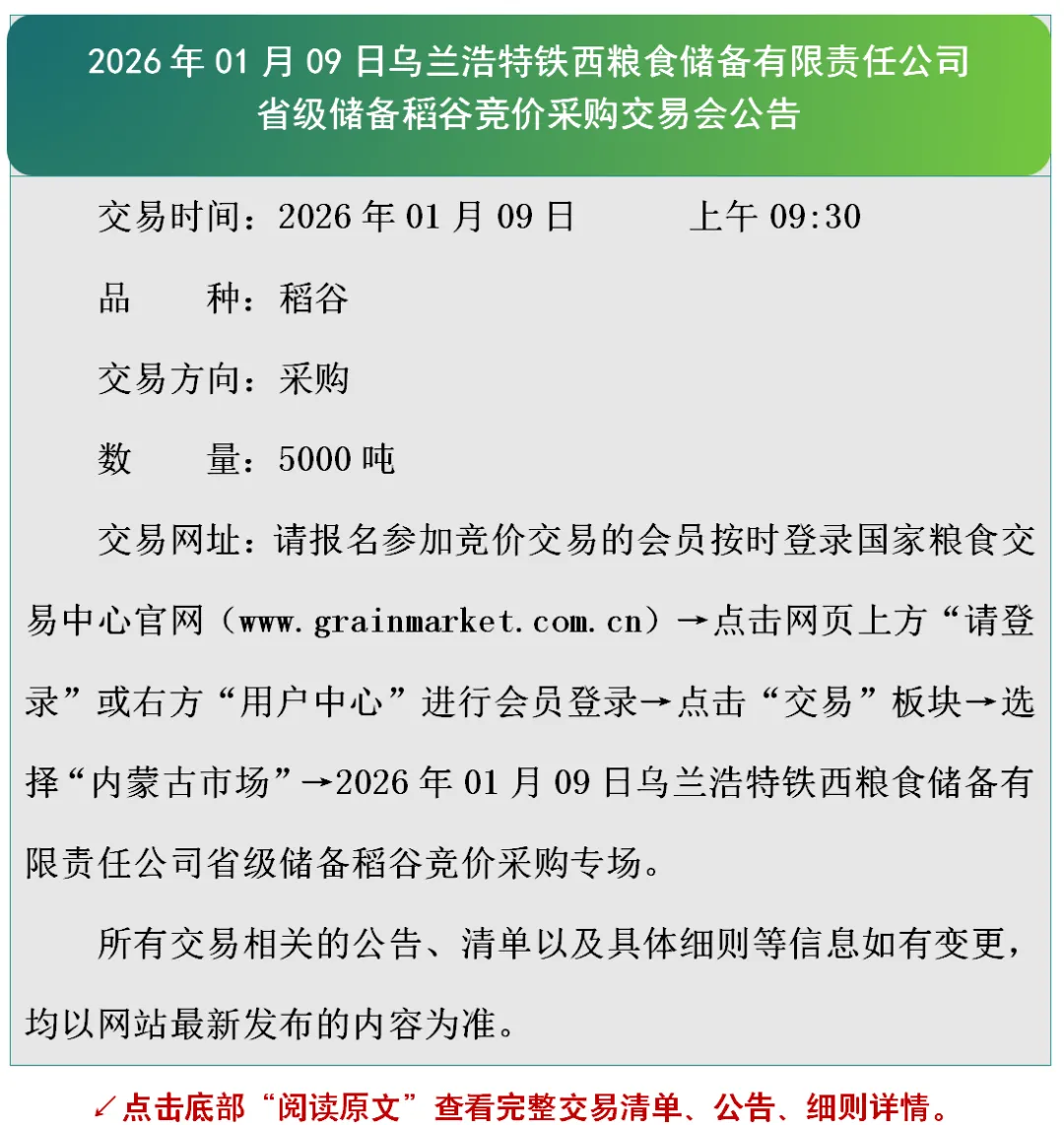 2026年01月09日乌兰浩特铁西粮食储备有限责任公司省级储备稻谷竞价采购交易会公告
