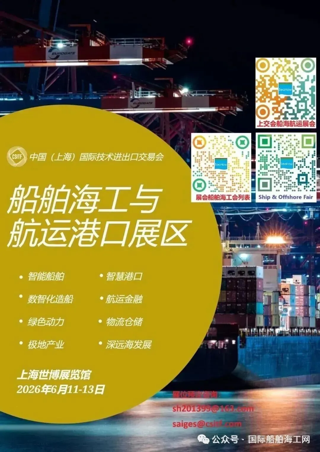 由上海市人民政府主办的国家级、国际性、综合型展会2026年第十二届中国(上海)国际技术进出口交易会(简称“上交会”,英文缩写“CSITF”)将于6月11-13日在上海世博展览馆盛大举办。本届上交会将继续进一步特设船舶海工与航运港口、机器人与人工智能、科技金融等主题展览展区以及系列论坛会议,持续打造具有行业影响力的专业板块。同时国际船舶海工网和低空天地平台将在上交会支持下,同期配套召开系列专业论坛。咨询报名:china@ishipoffshore.com 或 chinabobli@126.com