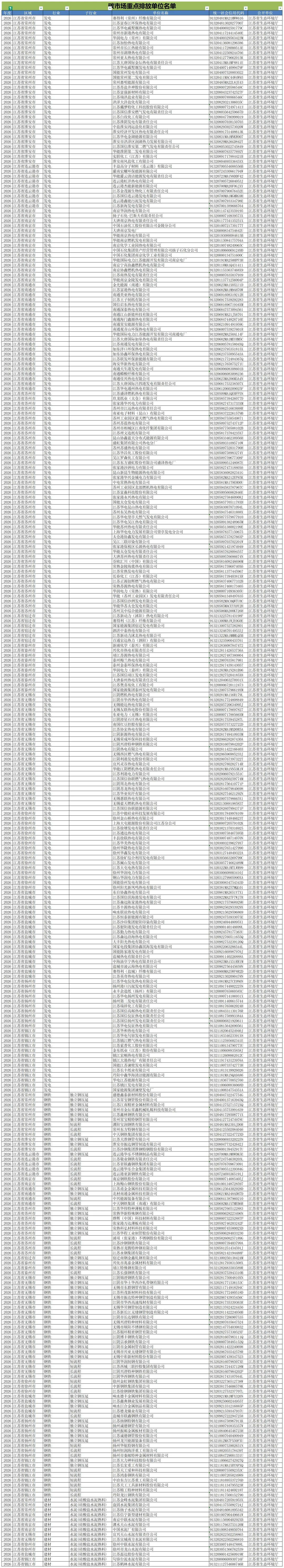 在发电行业纳入重点排放单位情况:常州市16家;淮安市16家;连云港市9家;南京市15家;南通市22家;苏州市45家;宿迁市6家;泰州市10家;无锡市24家;徐州市16家;盐城市18家;扬州市10家;镇江市13家。