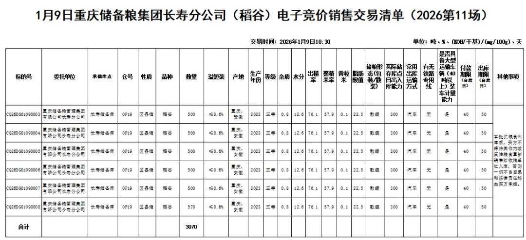 受重庆储备粮管理集团有限公司长寿分公司委托,重庆市粮油批发市场有限责任公司(即国家粮食重庆交易中心,以下简称“批发市场公司”),定于2026年1月9日10:30举办重庆储备粮集团长寿分公司(稻谷)电子竞价销售交易会,现将有关事项公告如下: