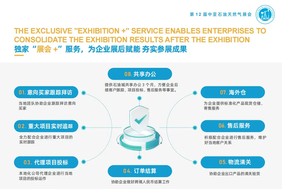 中亚石油天然气展会,由哈萨克斯坦能源协会、哈萨克斯坦油服协会、哈萨克斯坦化工协会、哈萨克斯坦石油天然气委员会和哈萨克斯坦全国企业联合会联合主办,是聚焦中亚五国及俄罗斯石油天然气能源领域的专业展会,每年在哈萨克斯坦石油主产区——曼吉斯套州阿克套市举办,吸引 3500 多名专业采购商到场参观采购。展会致力于帮助中国石油天然气装备企业一站式全面深度开发中亚市场,为石油、天然气、化工领域供采双方提供“线上线下、精准邀约、供采见面、产品展示、海外推广、新品发布、全程跟踪”七大对接服务,至今已累计服务参展商 292 家,采购商 12816 名,达成成交订单和重大意向订单金额共计 23.7 亿元人民币,是中国石油、天然气及化工装备企业“走出去”,直接对接中亚终端用户、贸易商及代理公司的重要平台。