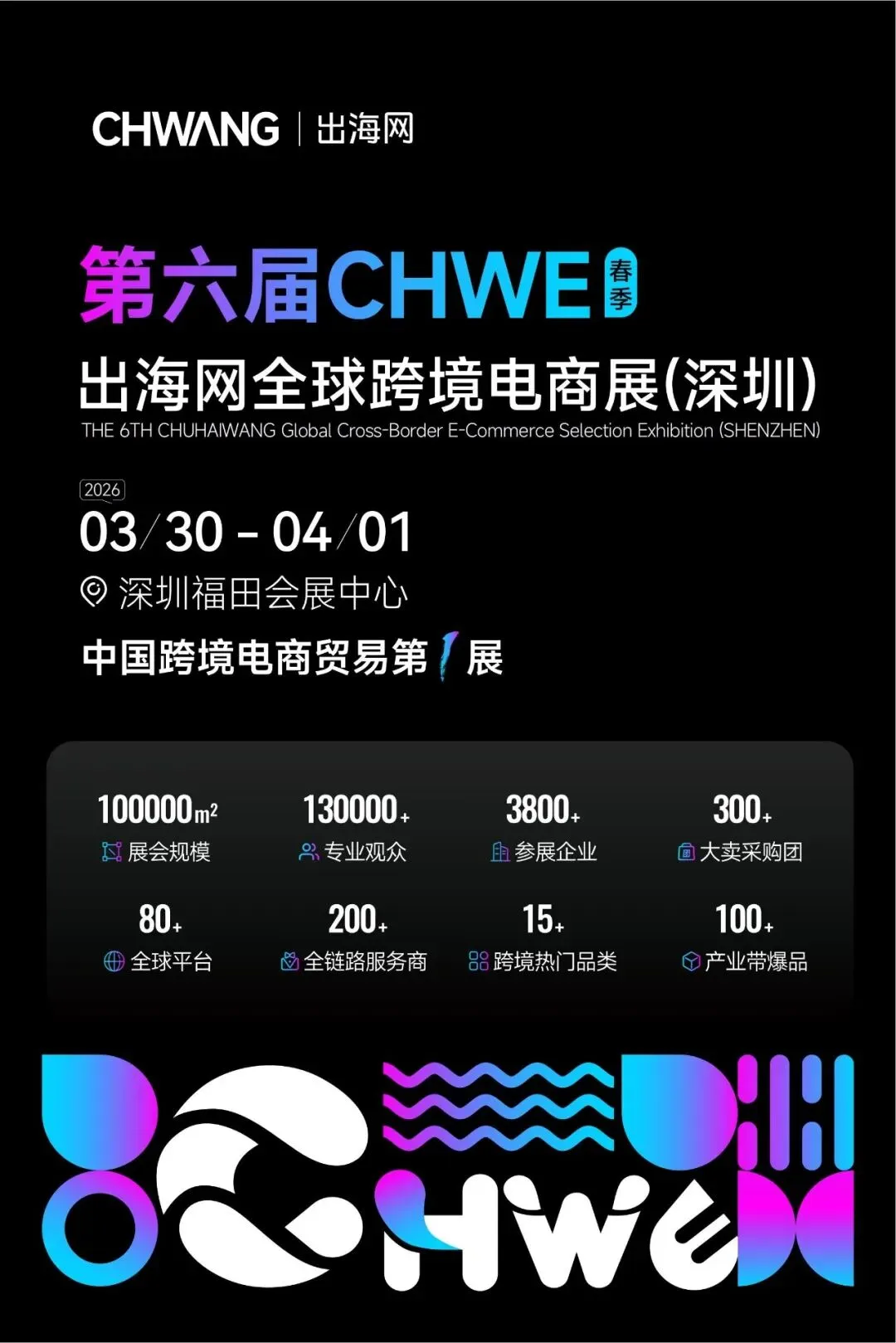 CHWE出海网全球跨境电商展,致力于打造成为中国跨境电商贸易第一展,打造B2C+B2小B+DTC+DTB的多元生态。旨在构建行业交流与合作平台,链接中国优质供应链与链接全球消费需求,为中国跨境产业出海全面赋能。2026年3月30日-4月1日,由出海网主办的第六届CHWE出海网全球跨境电商展(深圳)将在深圳福田会展中心盛大召开!2026年抢占商机,就上CHWE!