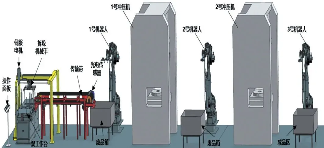 工业机器人冲压生产线(图2)主要由工业机器人、冲压机、拆垛机械手、双工作台、传送带、操纵台、伺服电机、气缸、电磁阀、传感器等部件组成,采用双工作台移动、工业机器人搭载机械手输送方式。
