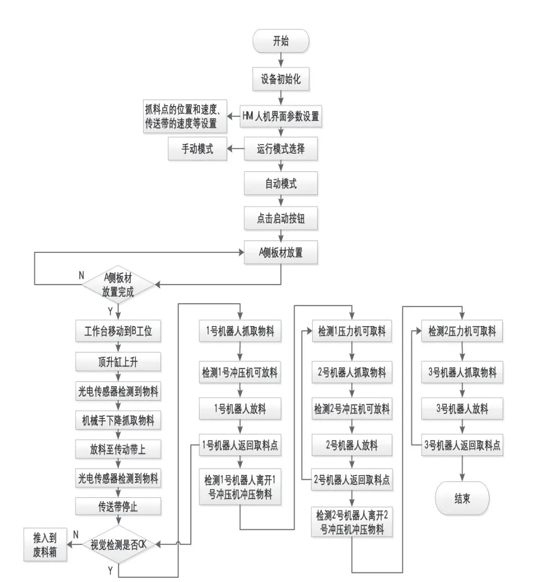 首先初始化运行状态,打开操作面板,并选择自动操作模式,点击启动,机器人运行到待抓取位,伺服电机回零点;当A 侧板材放置完成后,工作台移动到B 工位,顶升缸上升,光电传感器检测到物料后,机械手在伺服电机的带动下,下降抓取物料,放置到传送带上,传输到传送带的末端,光电传感器检测到物料后,传送带停止,完成物料视觉检测。如果物料有缺陷,将直接推入到废料箱中;如果物料检测合格,1 号机器人抓取物料,放置到工序一冲压机上冲制产品,2 号机器人检测取料信号后到1 号冲压机内取料,并放置到工序二冲压机上冲制产品,完成后给3 号机器人发出取料信号,3 号机器人检测到取料信号后到2 号冲压机内取料放置到成品箱中,完成单次生产流程,图3 为工业机器人冲压生产线工作流程。