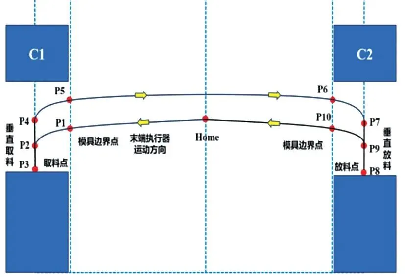 为了避免机器人在上下料过程中与冲压设备发生碰撞,保障上下料运动轨迹连续平稳,考虑到机器人末端执行器速度和角加速度的影响,需要对机器人末端执行机构进行轨迹规划,针对特殊点设置进行标定和轨迹优化,其中2 号机器人上下料末端执行器轨迹规划基本思路如图4 所示。