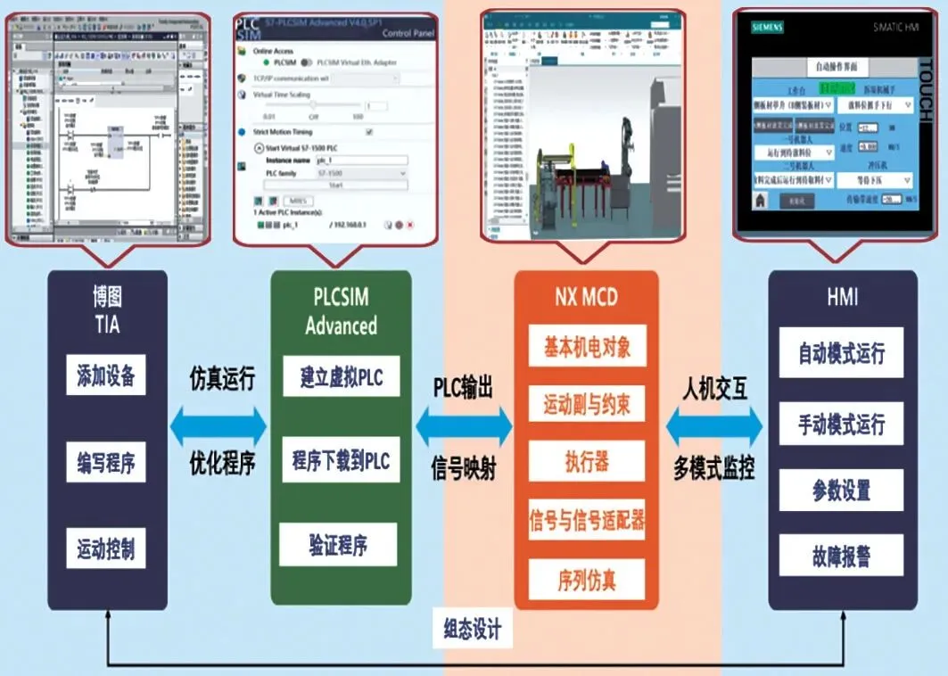 工业机器人冲压生产线虚拟调试方案主要包括三个部分NX MCD、博图TIA 和PLM Advanced。首先在NX MCD 中创建生产线的数字化模型,定义基本机电对象属性;其次根据生产线的工作流程,运用博图TIA 软件进行组态设计和编写程序,并将其下载到PLC Advanced 中仿真程序,完成PLC 程序验证;通过MCD 中信号映射设置,将MCD 与PLC 进行通讯,实现速度、位置等信号控制,实现机械部分的仿真运动和机器人运行轨迹编程验证(图5)。